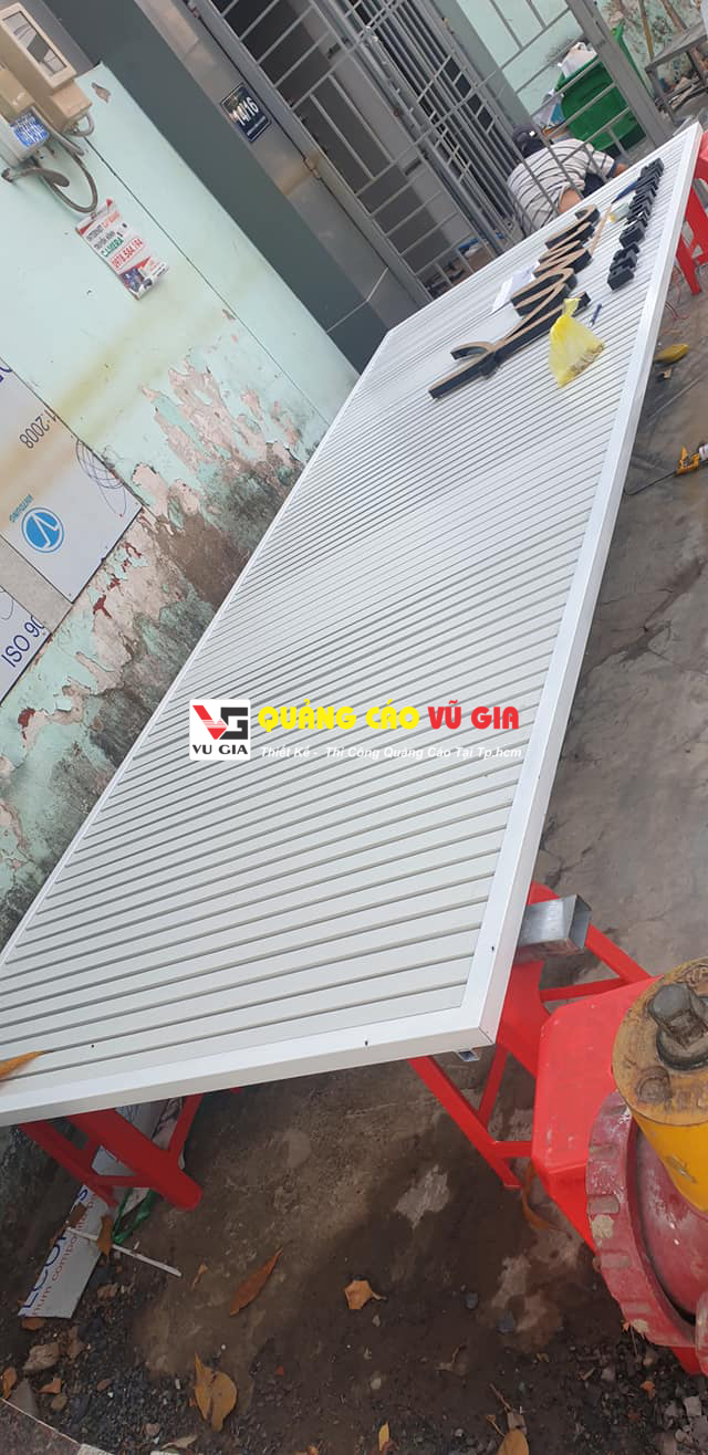 Mẫu bảng hiệu thanh lam này được Vũ Gia thi công với chủ đề đơn giản mà độc đáo. Không cần nhiều thông tin trên biển nhưng lại thể hiện được cá tính và thương hiệu riêng cho cửa hàng. Những thanh lam nhôm được sơn màu ghi trắng kết hợp với chữ nổi đặt góc tạo nên sự thanh thoát cho chiếc bảng hiệu.